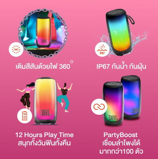 JBL PULSE 5 หนึ่งในลำโพงพกพาที่ล้ำที่สุดในยุคนี้ สว่างไสวไปกับแสงสีที่สะดุดตา แบบ 360 องศา ซิงค์ไปกับจังหวะเพลง ปลดปล่อยเสียงและพลังเบสทุ้มลึกแบบรอบทิศทาง พร้อมพกพาไปได้ทุกที่ ด้วยดีไซน์ที่โดดเด่นกว่าเดิม ขนาดที่ใหญ่ขึ้น Logo ปรับโฉมใหม่ สวย เก๋ เท่กว่าเดิม การันตีด้วยรางวัล Reddot Design Award 2022