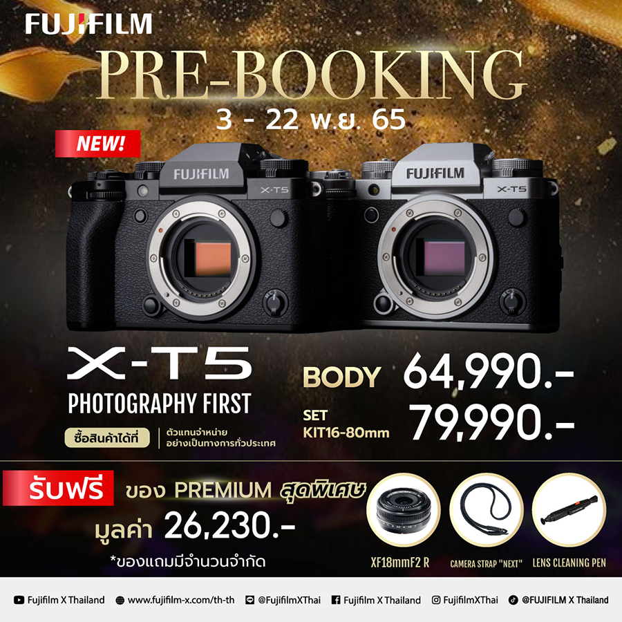 FUJIFILM X-T5 มีให้เลือก 2 โทนสีทั้ง Black และ Silver เปิดพรีออร์เดอร์ทั้งสองผลิตภัณฑ์ได้ตั้งแต่ 3 - 22 พฤศจิกายน 2565 ที่ตัวแทนจำหน่ายอย่างเป็นทางการทั่วประเทศ พร้อมรับของพรีเมี่ยมสุดพิเศษมูลค่ารวม 26,230 บาท