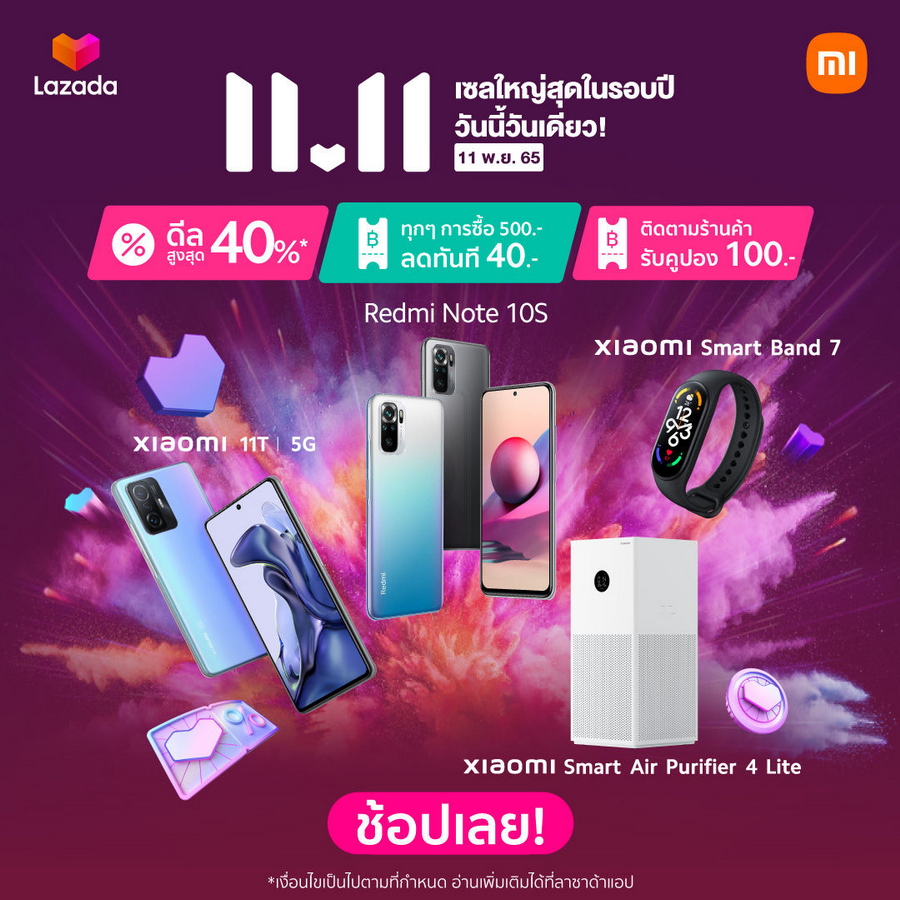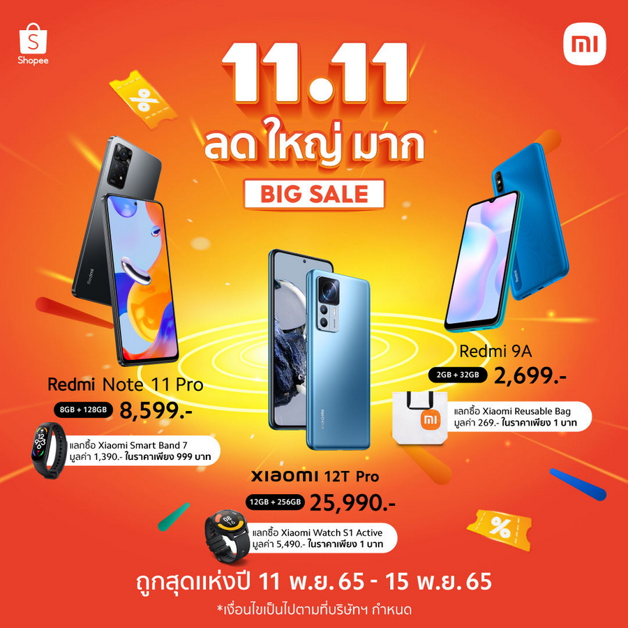 | Redmi Note 11 Pro | 8GB + 128GB | 8,599 | แลกซื้อ Xiaomi Smart Band 7 มูลค่า 1,390 บาท ในราคาเพียง 999 บาท |