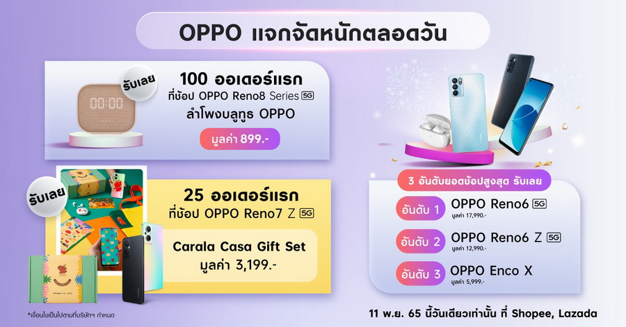 OPPO แบรนด์อุปกรณ์อัจฉริยะชั้นนำระดับโลก จัดเต็มทุกดีล ส่งโปรใหญ่สุดคุ้มตลอดวันต้อนรับกลางเดือนพฤศจิกายน ผ่านแคมเปญ “OPPO 11.11 Big Deal Ever” มอบส่วนลดสมาร์ตโฟนและอุปกรณ์ IoT สูงสุด 50% และคูปองลดสูงสุด 5,000 บาท เฉพาะวันที่ 11 พฤศจิกายน 2565 ที่ OPPO Official Store บน Shopee และ Lazada วันเดียวเท่านั้น ห้ามพลาด!