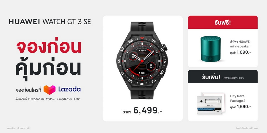 HUAWEI WATCH GT 3 SE วางจำหน่ายในราคา 6,499 บาท พร้อมโปรโมชันพรีออเดอร์ รับฟรี! HUAWEI Mini Speaker มูลค่า 1,090 บาท และสิทธิพิเศษสำหรับ 50 ออเดอร์แรกรับฟรี! City Travel Package 2 มูลค่า 1,690 บาท เมื่อสั่งซื้อตั้งแต่วันที่ 11 พฤศจิกายน 2565 ถึง 14 พฤศจิกายน 2565 ที่ร้านค้าอย่างเป็นทางการของหัวเว่ยที่