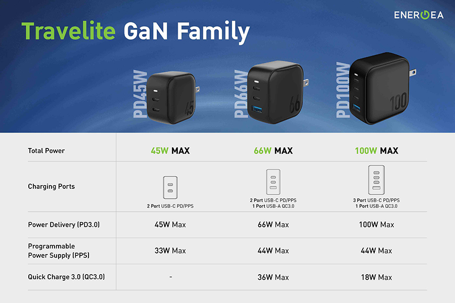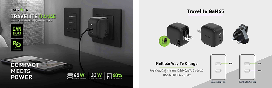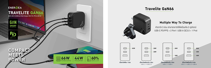 เริ่มที่ Travelite Gan100 และ TravelHub GaN100 ที่ออกแบบมาให้เป็นทั้ง Wall Charger และ Desktop Charger ด้วยตัวต่อสายชาร์จแบบ US ที่มีมาให้ ทั้งสองรุ่นนี้มีพอร์ต USB 4 พอร์ต ปล่อยกำลังไฟสูงสุด 100 วัตต์ USB-C PD/PPS 3 พอร์ต และ USB-A QC 3.0 1 พอร์ต ชาร์จได้พร้อมกัน 4 อุปกรณ์ รองรับ Power Delivery 100W (PD100W) ชาร์จเร็วสูงสุด 100 วัตต์ ชาร์จ iPhone 8 ขึ้นไปได้ 50% ภายใน 30 นาที สามารถชาร์จ MacBook Pro M1 ได้ รองรับ Programmable Power Supply (PPS44W) ชาร์จเร็วสูงสุด 44 วัตต์ สำหรับชาร์จอุปกรณ์ Android ที่รองรับ และรองรับ Quick Charge 3.0 (QC3.0 18W) ชาร์จเร็วสูงสุด 18 วัตต์ ชาร์จอุปกรณ์ได้เร็วกว่าปกติ 4 เท่า เมื่อเทียบกับหัวชาร์จมาตรฐานทั่วไป โดย Energea หัวชาร์จ Wall Charger USB-C PD100W/PPS44W & QC 3.0 รุ่น Travelite GaN100 วางจำหน่ายในราคา 3,290 บาท และ Energea หัวชาร์จ Wall Charger & Desktop Charger USB-C PD100W/PPS44W & QC 3.0 รุ่น TravelHub GaN100 วางจำหน่ายในราคา 3,590 บาท
