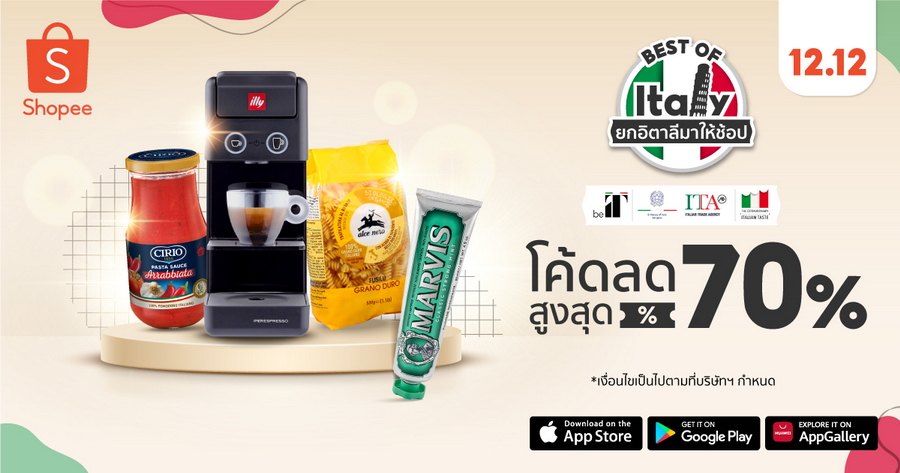 #ทีมอิตาลี เตรียมพบกับความสุขสุดเซอร์ไพรส์ในช่วงเปิดตัวแคมเปญ ‘Best of Italy ยกอิตาลีมาให้ช้อป’ ที่ได้พาเหรดแบรนด์สินค้า ‘Made in Italy’ ชั้นนำบน Shopee Mall และ Shopee Premium ทั้งในหมวดหมู่อาหารและเครื่องดื่ม ของใช้ในครัว ผลิตภัณฑ์เพื่อความงาม ของใช้ส่วนตัว ที่มาพร้อมข้อเสนอพิเศษอย่างโค้ดลดสูงสุด 70%