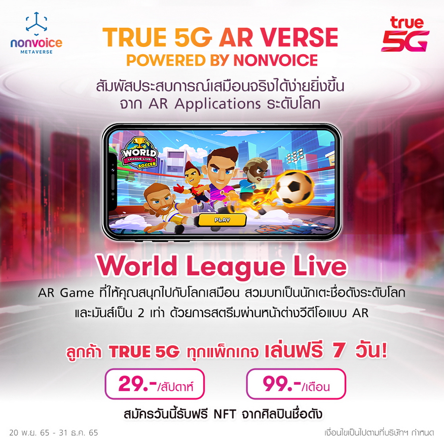 ลูกค้า True 5G ที่เป็นแฟนบอลและคอเกมต้องไม่รอช้า มันกับ AR เกมและแอปพลิเคชันระดับโลก ฟรี 7 วัน เมื่อสมัครบริการ True 5G AR VERSE Powered by Nonvoice ตั้งแต่วันที่ 20 พ.ย. 65 – 31 ธ.ค. 65 พร้อมรับรางวัลเป็นของสะสมดิจิทัล NFT ใหม่ทุก 7 วัน ฟรี และพบกับแอปใหม่ที่น่าตื่นเต้นทุกเดือนโดยไม่มีค่าใช้จ่ายเพิ่มเติม แล้วมาสนุกด้วยกัน!