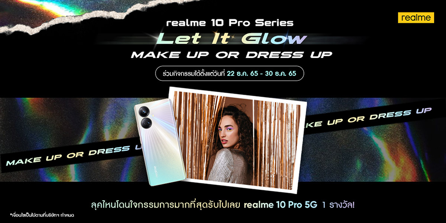 วันนี้ realme ขอส่งต่อความสุขสู่ผู้บริโภคอย่างต่อเนื่องกับแคมเปญ Let It Glow ชวนแฟน ๆ มาร่วมสร้างสรรค์เครื่องแต่งกายหรือสไตล์การแต่งหน้าสุดล้ำ (MAKE OR DRESS UP) ให้ตรงตามคอนเซ็ปต์ของ realme 10 Pro Series แล้วโพสต์รูปผลงานใต้โพสกิจกรรมบนเฟซบุ๊ก realme Official Fan Page พร้อมใส่แฮชแทก #InspiredByrealme #LetItglow #realmegoldenxmas โดยร่วมสนุกได้ตั้งแต่วันที่ 22 - 30 ธันวาคม 2565 ผู้ที่ถูกใจกรรมการ รับไปเลย realme 10 Pro 5G 1 เครื่อง โดยจะประกาศผลผ่านทางเฟซบุ๊กในวันที่ 4 มกราคม 2566