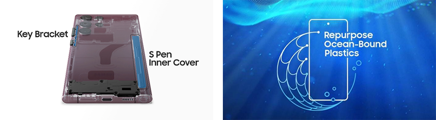 Galaxy S22 ก่อนนำวัสดุรีไซเคิลที่คิดค้นมาใช้เป็นวัสดุในการออกแบบอุปกรณ์อิเลคโทรนิคส์ให้กับผลิตภัณฑ์ในซีรีส์ Galaxy ต่างๆ อาทิ แท็บเล็ต คอมพิวเตอร์ แล็ปท็อป และหูฟัง การคิดค้นดังกล่าวเป็นการผสานความร่วมมือกับองค์กรต่างๆ ที่มีพันธกิจและวิสัยทัศน์เดียวกัน ส่งผลให้ซัมซุงสามารถสร้างสรรค์วัสดุใหม่ที่ผลิตจากวัสดุรีไซเคิลอย่างมีประสิทธิภาพสูงสุด