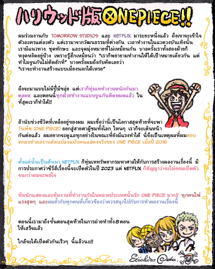 ONE PIECE (วันพีซ) ฉบับคนแสดง โดยในจดหมาย อาจารย์โอดะ ย้ำถึงการทำงานอย่างหนักของทีมงานทุกฝ่ายที่ต่างก็เต็มที่ และตั้งใจทำงานร่วมกันอย่างไม่หยุดหย่อน พร้อมเล่าต่อว่า “ทีมนักแสดงและทีมงานที่ทำงานกันในหลายประเทศนั้นรัก