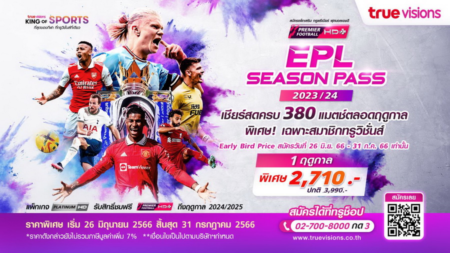 ทรูวิชั่นส์ ผู้นำคอนเทนต์กีฬาระดับโลก ตอกย้ำความเป็น KING OF SPORTS ประกาศคว้าลิขสิทธ์พรีเมียร์ลีก ฟุตบอลลีกอันดับ 1 ของโลก ส่งตรงการถ่ายทอดสดครบ 380 แมตช์ตลอดฤดูกาลแบบเอ็กซ์คลูซีฟแต่เพียงผู้เดียว พร้อมชวนลูกค้าและแฟนบอลชาวไทยเปิดประสบการณ์การรับชมแบบจัดเต็ม ไม่พลาดทุกช็อตสำคัญ ทุกวินาทีด้วยภาพและเสียงคมชัดระดับเอชดี สัญญาณเสถียรกว่า เสมือนชมพร้อมคนอังกฤษ เต็มอรรถรสกับทีมพากย์คุณภาพที่เป็นเอกลักษณ์ของทรูวิชั่นส์ พิเศษสุด! สำหรับลูกค้าแฟนพันธ์แท้ฟุตบอล สามารถสมัครแพ็กเกจสุดคุ้ม “EPL SEASON PASS 2023/24” EARLY BIRD เพียง 2,710 บาท (จากปกติ 3,990 บาท) และมันส์กันต่อเนื่อง แบบคุ้มยิ่งกว่า ให้เหล่าคอบอลสามารถชมพรีเมียร์ลีก และ ยูฟ่า แชมเปียนส์ลีก รวมฟุตบอลลีกดัง กว่า 1,500 แมตช์ตลอดฤดูกาล ในแพ็กเกจสุดพิเศษ “EPL&UEFA SEASON PASS 2023/24” EARLY BIRD เพียง 3,500 บาท (จากปกติ 5,489 บาท) เฉพาะสมาชิกทรูวิชั่นส์แบบรายเดือน เหมาจ่ายตลอดฤดูกาล