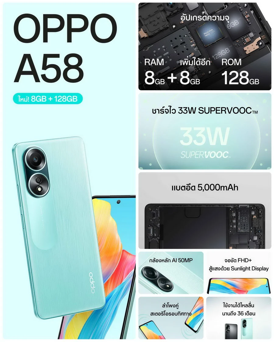ใหม่! OPPO A58 สมาร์ตโฟนน้องเล็กพร้อมอัปความจุให้ใช้งานได้เต็มพิกัดทุกความบันเทิงกว่าที่เคยด้วยการอัปเกรดความจุใหม่ RAM 8GB เพิ่มหน่วยความจำได้อีก 8GB พร้อม ROM 128GB จากเดิม RAM 6GB พร้อมตอบโจทย์ทุกเอ็นเตอร์เทนได้มากกว่าที่เคย ไม่ว่าจะดูหนัง ฟังเพลง หรือเล่นเกมก็ใช้งานได้อย่างลื่นไหล ใช้งานได้แบบไม่มีสะดุดด้วยชาร์จไว 33W SUPERVOOC และแบตเตอรี่ใหญ่ 5,000mAh มาพร้อมลำโพงสเตอริโอคู่ โหมด Ultra Volume ช่วยเพิ่มระดับเสียงขึ้นถึง 300% เมื่อใช้ลำโพงโดยไม่ทำให้คุณภาพเสียงลดลง และมอบการรับชมที่เต็มอิ่มทุกอรรถรส เสริมความสมจริงด้วยหน้าจอกว้าง 6.72” คมชัด FHD+ สู้แสงด้วย Sunlight Display และสำหรับสายโซเชียลยังมาพร้อมกล้องหลัก AI 50MP ถ่ายภาพสวย สนุกทุกมุมด้วย เก็บครบทุกโมเมนต์ได้มากยิ่งขึ้นแบบไม่ต้องลบ