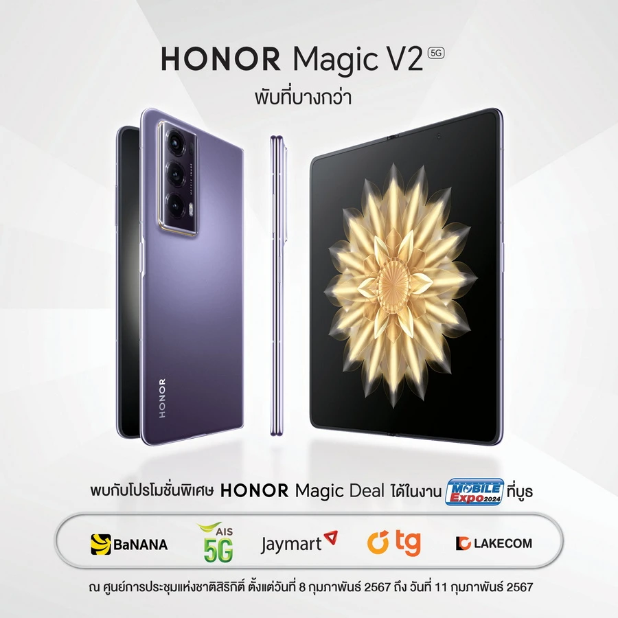 ห้ามพลาด! HONOR ชวนทุกคนร่วมสัมผัสมหัศจรรย์ความบางและเบาที่สุดกับสมาร์ตโฟนจอพับเรือธงรุ่นใหม่ HONOR Magic V2 ก่อนใคร ในงานมหกรรมมือถือที่ใหญ่ที่สุดในประเทศไทย Thailand Mobile Expo 2024 ที่จัดขึ้น เป็นครั้งที่ 42 ในวันที่ 8 - 11 กุมภาพันธ์ 2567 ณ ศูนย์การประชุมแห่งชาติสิริกิติ์ โดยภายในงานทุกคนจะได้พบกับโปรโมชันพิเศษ พร้อมรับของพรีเมียมจากทาง HONOR มากมาย