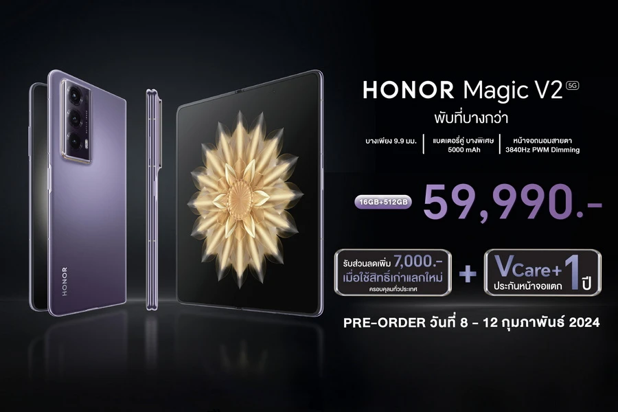 ออเนอร์ (HONOR) ผู้ให้บริการอุปกรณ์อัจฉริยะชั้นนำระดับโลก เดินหน้ารุกตลาดสมาร์ตโฟนจอพับในประเทศไทย หวังขยายตลาดในกลุ่มระดับไฮเอนด์ ประกาศเปิดตัวสมาร์ตโฟน จอพับระดับแฟลกชิป “HONOR Magic V2” ภายใต้สโลแกน “พับที่บางกว่า – Foldable Ultra Slim” ด้วยการมอบประสบการณ์การใช้งานที่ดีที่สุด พร้อมชูจุดขายด้วยดีไซน์เหนือชั้นที่บางและเบา ตัวเครื่องบางเพียง 9.9 มิลลิเมตร ขณะพับหน้าจอ และบางเพียง 4.7 มิลลิเมตร เมื่อกางออก ซึ่งเป็นสมาร์ตโฟนจอพับเพียงหนึ่งเดียวที่บางกว่า สมาร์ตโฟนทั่วไปบางรุ่นในตลาดปัจจุบัน ผสานการใช้งานที่สมบูรณ์แบบต่อเนื่องยาวนานด้วยแบตเตอรี่คู่ซิลิคอนคาร์บอนขนาดใหญ่ 5000mAh มาพร้อมหน้าจอถนอมสายตาขนาดใหญ่ 7.92 นิ้ว ตอบโจทย์การรับชมคอนเทนต์ความบันเทิงได้อย่างสบายตาและเต็มอรรถรส เปิดตัวในราคา 59,990 บาท พร้อมโปรโมชันพิเศษช่วงพรีออเดอร์ในวันที่ 8 – 12 กุมภาพันธ์ 2567 เริ่มจำหน่ายตั้งแต่วันที่ 13 กุมภาพันธ์ 2567 เป็นต้นไป