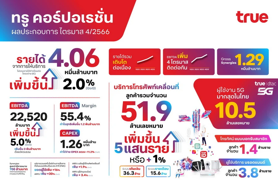 บมจ. ทรู คอร์ปอเรชั่น รายงานผลประกอบการปี 2566 รายได้รวมจากธุรกิจหลักเติบโตดีขึ้นทั้งจากการให้บริการโทรศัพท์เคลื่อนที่และบริการออนไลน์ พร้อมยอดผู้ใช้บริการโทรศัพท์เคลื่อนที่เพิ่มขึ้น มูลค่า Synergy ปี 2566 ได้เกินเป้าหมายจากการเร่งการดำเนินการตามแผนงานสำคัญต่างๆ โดย EBITDA เพิ่มขึ้นเป็นไตรมาสที่ 4 ติดต่อกันเป็นผลมาจากการรับรู้ผลประโยชน์จากการควบรวม (Synergy) และการเพิ่มประสิทธิภาพในการดำเนินงาน