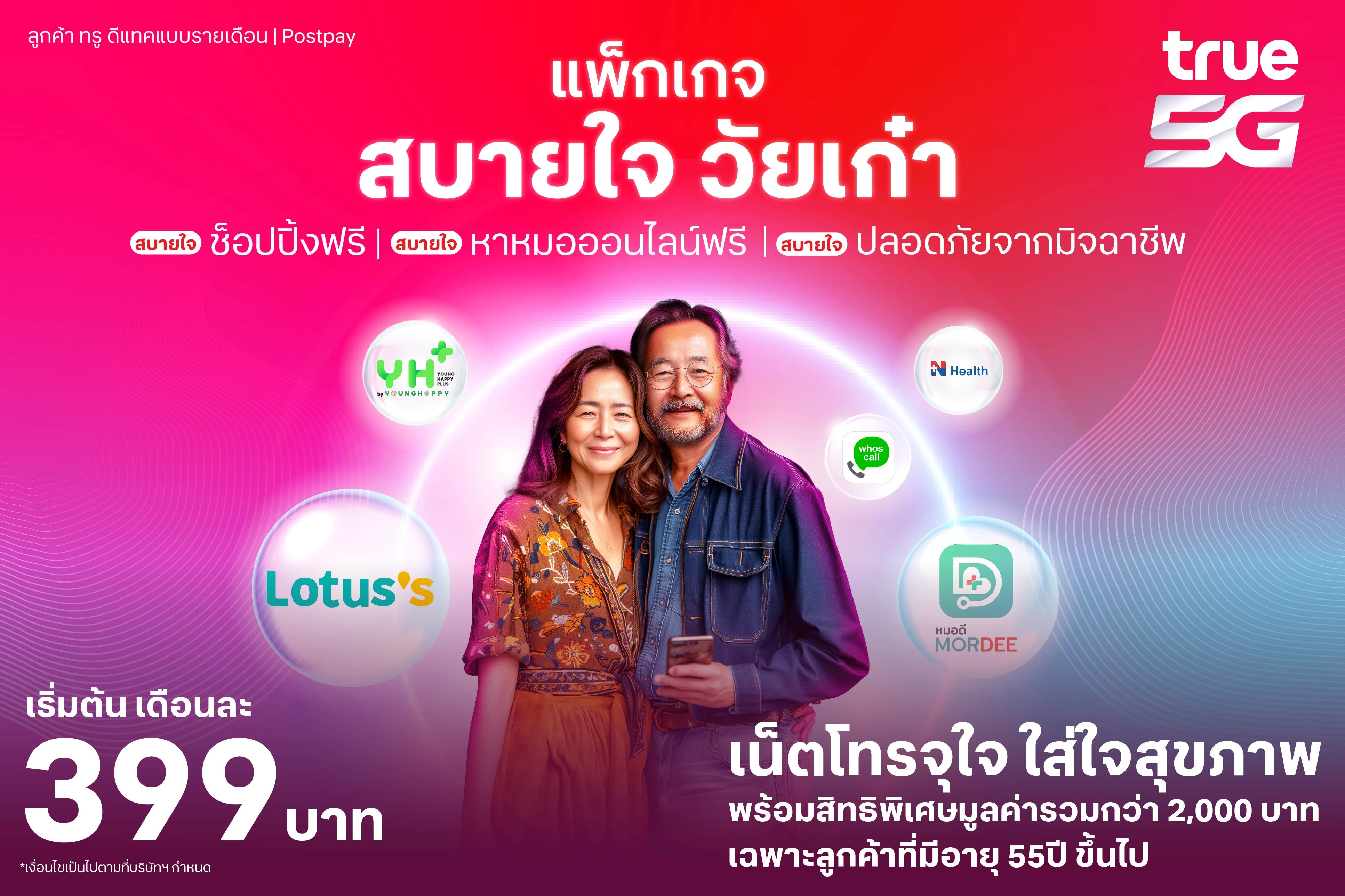 โดนใจวัยเก๋า...ทรู ยกระดับประสบการณ์ชีวิตอัจฉริยะ และไลฟ์สไตล์ทั้งความสะดวกสบาย การดูแลสุขภาพ เพื่อวัยเก๋าโดยเฉพาะ ครอบคลุม ครบครัน ทั้งแพ็กเกจ แบบรายเดือน"สบายใจ วัยเก๋า" เน็ตโทรจุใจ ใส่ใจสุขภาพ ให้สบายใจ ช็อปปิ้งฟรี หาหมอออนไลน์ฟรี ปลอดภัยจากมิจฉาชีพ พร้อมสิทธิพิเศษมูลค่ารวมกว่า 2,000 บาท เฉพาะวัยเก๋า อายุ 55 ปีขึ้นไป แพ็กเกจเสริมเติมเงิน "โปรปังรับปีมังกร พิเศษเฉพาะวัยเก๋า" พร้อมจัดเตรียมเจ้าหน้าที่บริการหลังการขาย เพื่อกลุ่มผู้สูงวัยโดยเฉพาะ รวมทั้งจัดกิจกรรมเรียนรู้เทคโนโลยีสำหรับผู้สูงอายุทั้ง Smart Senior Walk Rally และดิจิตอล 101 เพื่อให้ความรู้ เสริมทักษะ สร้างความปลอดภัยยุคดิจิทัลแก่กลุ่มผู้สูงวัย เพื่อคุณภาพชีวิตที่ดียิ่งขึ้นในยุคดิจิทัล...วัยเก๋าทำได้