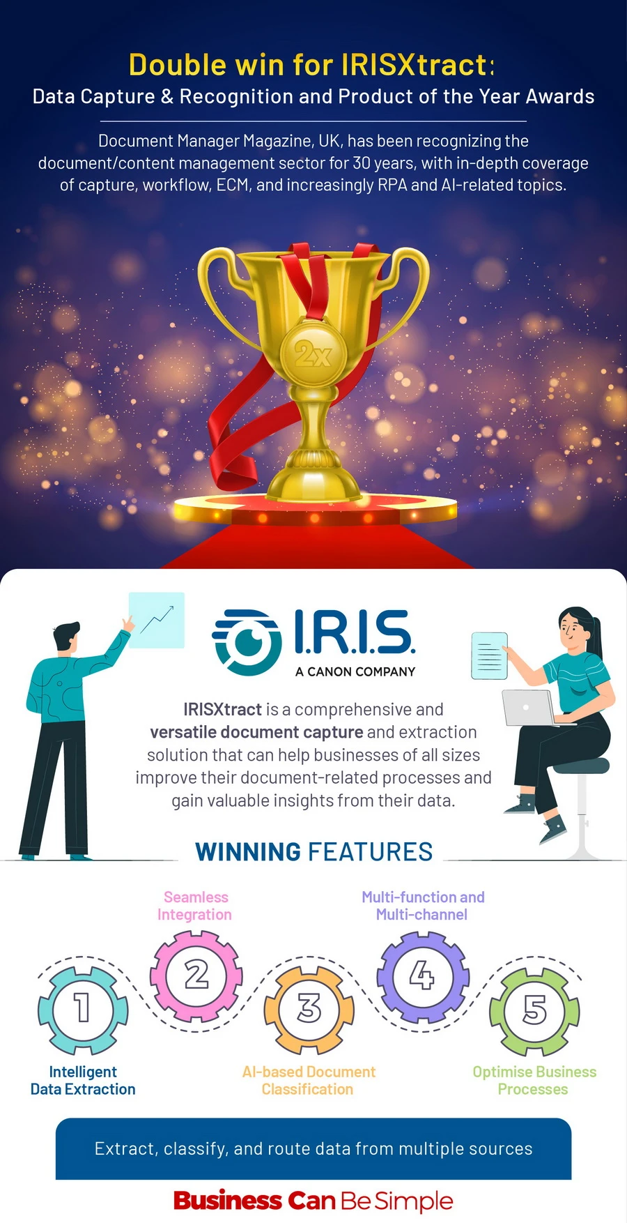 - ซอฟต์แวร์ IRISXtract ชนะรางวัล "Document Manager Awards - Data Capture & Recognition and Product of the Year" ในฐานะซอฟต์แวร์การแยกประเภทเอกสารและการดึงข้อมูลที่มีประสิทธิภาพ ช่วยประมวลผลแบบอัตโนมัติที่มีคุณภาพสูงสุดและเชื่อถือได้สำหรับทุกเอกสารและทุกกระบวนการทำงาน