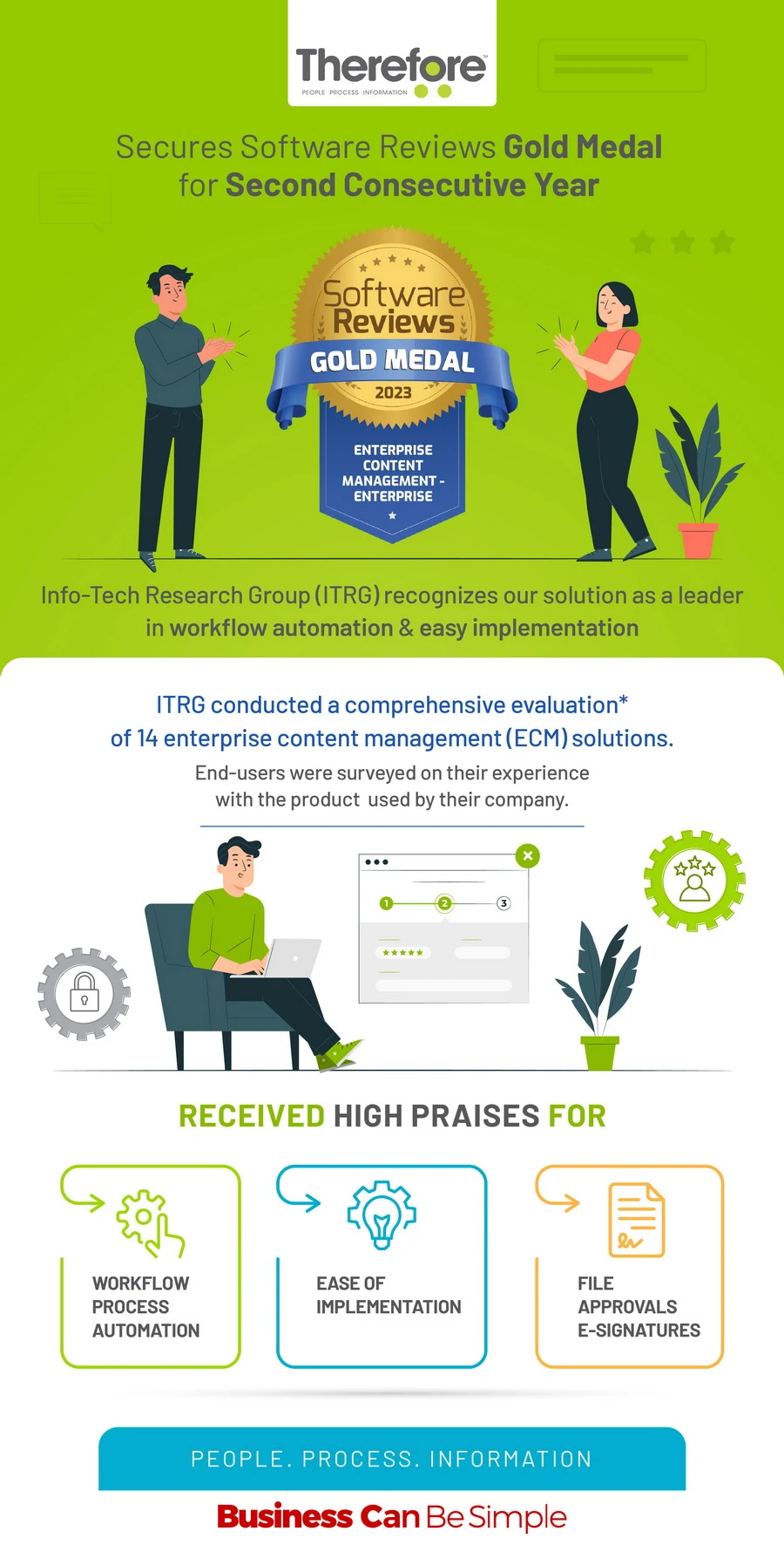 - โซลูชัน Therefore ได้รับรางวัล “SoftwareReview – Gold Medal” ในฐานะโซลูชันอัจฉริยะสำหรับการจัดการเอกสารที่ติดตั้งง่าย ช่วยให้สามารถรวบรวมข้อมูล ดึงข้อมูล จัดทำดัชนี และจัดเก็บข้อมูลถาวรได้อย่างมีประสิทธิภาพ ปรับปรุงเวิร์กโฟลว์เอกสารให้เป็นระบบอัตโนมัติสำหรับองค์กรธุรกิจขนาดเล็กหรือขนาดใหญ่
