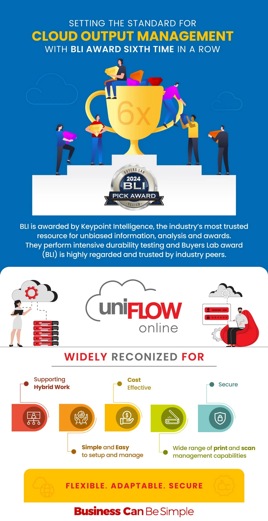 - ซอฟต์แวร์ uniFLOW Online คว้ารางวัล "BLI Awards - Cloud Output Management" ในฐานะโซลูชั่นระบบคลาวด์ที่ช่วยยกระดับการพิมพ์ในองค์กร โดดเด่นด้วยฟังก์ชันที่ใช้งานง่าย เหมาะกับการทำงานแบบไฮบริด ช่วยลดต้นทุนธุรกิจ รองรับการพิมพ์และสแกนที่หลากหลายและมีความปลอดภัยสูง