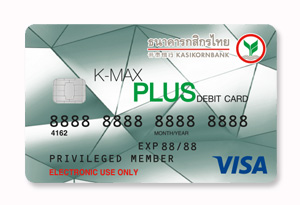 กสิกรไทย | ![]() บัตรเดบิต K-Max Plus | วงเงินสูงสุด 200,000 บาท | วงเงินสูงสุด 5,000 บาท/ครั้ง | วงเงินสูงสุด 300 บาท/วัน (สูงสุด 30 วัน) |