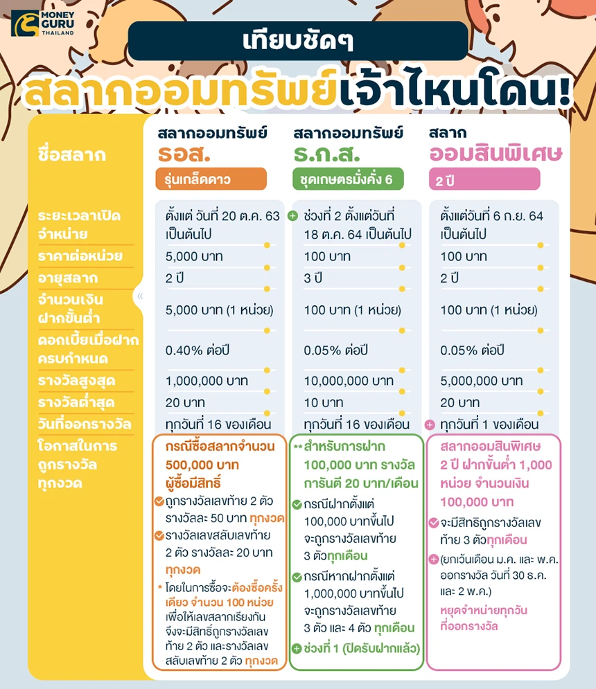 ซึ่งเราจะมาลองเปรียบเทียบรายละเอียด และผลตอบแทนของสลากแต่ละเจ้ากันว่าของเจ้าไหนน่าสนใจนะคะ