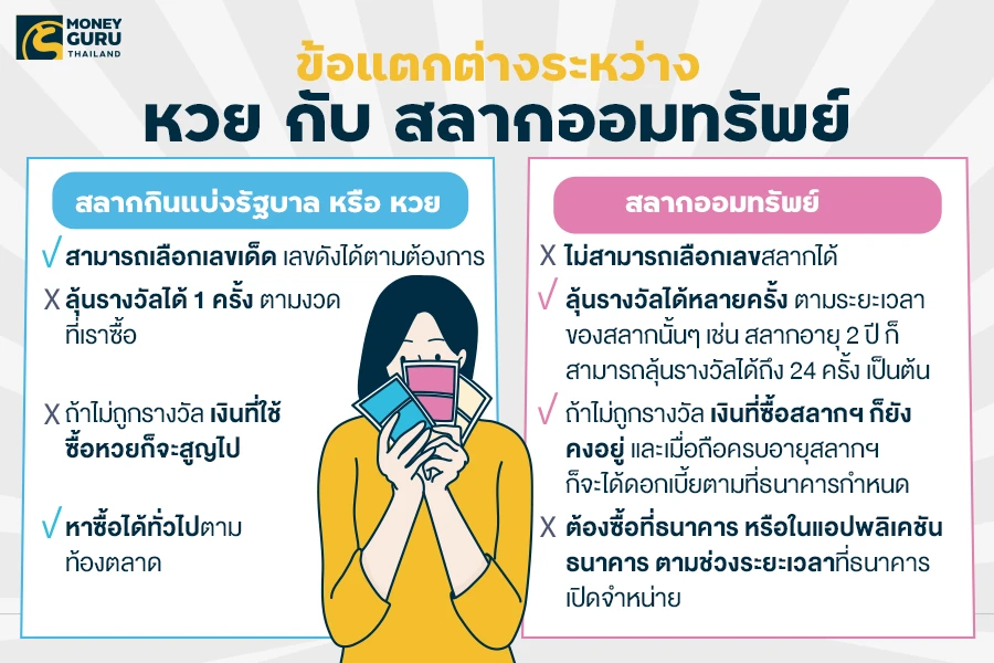 วันนี้...เราเลยจะพาดูข้อแตกต่างระหว่างการลงทุนในสลากกินแบ่งรัฐบาล กับการเลือกออมเงินกับสลากออมทรัพย์ หรือสลากออมสิน รวมไปถึงรางวัลที่เราอาจจะได้รับเมื่อถูกรางวัลกันนะคะ