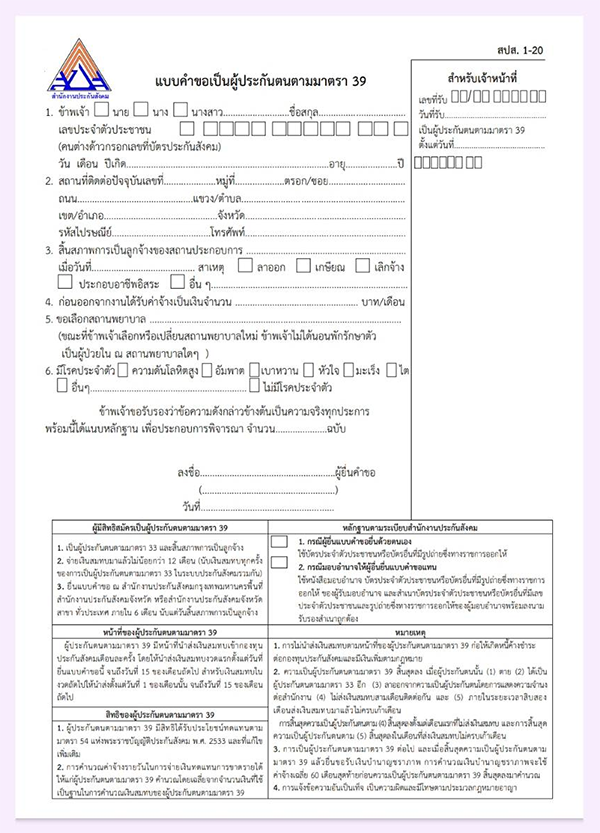 ตัวอย่างแบบคำขอเป็นผู้ประกันตนมาตรา 39 (สปส.1-20)