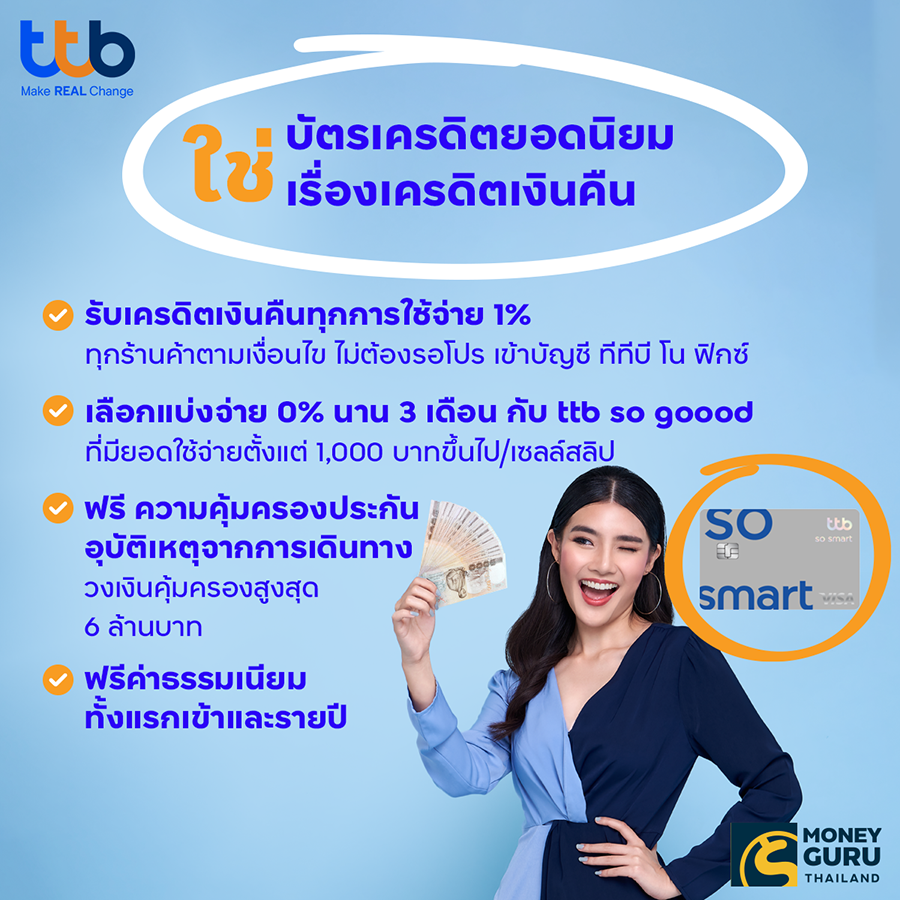 "บัตรเครดิต ttb so smart (ทีทีบี โซสมาร์ท)" เป็นบัตรเครดิต cashback ที่สามารถตอบโจทย์คุณได้ เพราะคุณจะได้รับเครดิตเงินคืนจากทุกๆ การใช้จ่าย 1% จากทุกร้านค้า ตามเงื่อนไข โดยธนาคารจะคืนเงินเข้าบัญชี ทีทีบี โน ฟิกซ์ โดยที่ไม่ต้องรอโปรโมชันกันเลย