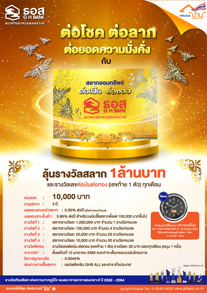 ทั้งนี้ ผู้ที่สนใจสามารถซื้อสลากออมทรัพย์ ธอส. ผ่าน Mobile Application : GHB ALL หรือที่สาขาของธนาคาร สอบถามรายละเอียดเพิ่มเติมได้ที่ ธอส. ทุกสาขาทั่วประเทศ หรือ ศูนย์ลูกค้าสัมพันธ์ (Call Center) โทร 0-2645-9000 หรือ Facebook Fanpage ธนาคารอาคารสงเคราะห์ และ ติดตามข้อมูลข่าวสารได้ที่ Application : GHB ALL และ www.ghbank.co.th