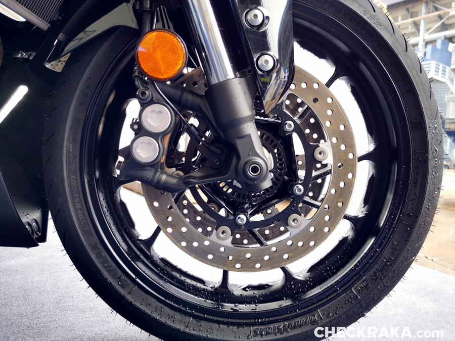 มิชชั่นการทดสอบขี่ ยามาฮ่า YZF-R7 ออนแทร็ค ถูกกำหนดขี่แบบวันเดียวแบ่งเป็น 5 กลุ่ม แต่ละกลุ่มมี 7 คัน (สื่อ) ได้รันกลุ่มละ 2 เซสชั่น ผู้เขียนอยู่ในกลุ่ม 2 แต่จากความตั้งใจทดสอบรถสแตนดาร์ดบนแทร็กแห้งกลายเป็นต้องรันบนแทร็คเปียกเพราะมีฝนตกลงมาก่อนหน้าและตลอดวันทดสอบ อย่างไรก็ตามทางเจ้าหน้าที่สนามและนักแข่งทีมยามาฮ่าได้ร่วมตรวจสอบสภาพสนามอยู่ตลอดเวลาเพื่อความปลอดภัยจริงๆ ของผู้ร่วมทดสอบทำให้ดีเลย์ไปบ้าง แต่สุดท้ายกลุ่มแรกก็ได้ไฟเขียวให้ออก การขี่ของแต่ละกลุ่มได้เวลา 15 นาที ต่อเซสชั่น ช่วงแรกทางทีมผู้จัดได้ให้ผู้ฝึกสอนมานำไลน์เสมือนวอร์มอัพแล็บ 2 รอบ แล้วจึงปล่อยให้วิ่งได้แบบอิสระ จนถึงคิวกลุ่ม 2 ของผู้เขียนที่ค่อนข้างกังวลกับสภาพสนามที่ยังเจิ่งนองด้วยน้ำ และฝนก็ยังพรำไม่หยุด ข้อควรระวังสำคัญในการขี่รถบนแทร็คของสนามช้างอินเตอร์เนชั่นแนลแบบนี้ก็คือ อย่าให้หลุดไปจนถึงขอบเคิร์บเพราะสีที่ทาไว้จะทำให้ยางสลิปได้ง่ายมาก และรถรุ่นนี้ไม่มีระบบแทร็คชันคอนโทรลทำให้ต้องเน้นเรื่องการเปิดคันเร่งออกจากโค้งให้มากขึ้นด้วย ผู้เขียนเพิ่งขี่ยามาฮ่า R7 เป็นครั้งแรกก็เจอความท้าทายเลย เรียกว่าไปทำความรู้จักกันในสนาม ช่วงแรกก็มีผู้ฝึกสอนนำไลน์ขี่เหมือนรอบวอร์มอัพ ผู้เขียนพยายามวอร์มหน้ายางตั้งแต่ขี่ออกจากพิท รวมไปทั้งวอร์มผ้าเบรกหน้าให้ถึงอุณหภูมิที่พร้อมทำงาน ช่วง 2 รอบแรกรู้สึกได้ถึงท่านั่ง โพซิชั่น ไรด์ดิ้ง ยังให้ความเป็นซูเปอร์สปอร์ตคล้ายกับรุ่นพี่ R6 ด้วยข้อมูลที่ได้จากทีมงานบริฟก่อนลงทดสอบ คือ ตำแหน่งแฮนด์ของ R7 นั้นอยู่สูงกว่า R6 นิดเดียว และไม่สูงเหมือน R3 ที่เป็นสปอร์ตทัวร์ริ่งมากกว่า นั่นทำให้เข้าใจได้ชัดเจนว่า R7 ถูกวางตำแหน่งการใช้งานไว้ทั้งบนถนนและแทร็คแบบสมดุล เริ่มจากทดสอบขี่ไปได้ลองจับอาการตอนเข้าโค้ง เร่ง และชะลอเบาเบรกตลอดจนการลดเกียร์แบบทีละจังหวะ ทั้งหมดให้การตอบสนองที่ดีและเกิดความคุ้นชินได้ไว รู้สึกได้ว่า R7 เป็นรถที่ขี่ในแทร็คง่ายตั้งแต่แรก ยิ่งใช้ยางมัลติคอมปาวด์รุ่นท็อป และสลิปเปอร์คลัตช์ทำให้การขี่ก่อนและขณะเข้าโค้งทำได้มั่นใจมากขึ้นตามรอบที่ขี่ ผู้เขียนใช้เวลาขี่ในเซสชั่นแรกเพื่อทำความเข้าใจการใช้เกียร์ คันเร่ง ในโค้งต่างๆ และจับอาการที่ต้องระวัง พอสรุปช่วงแรกได้ว่าด้วยกำลังของ R7 ระดับ 73 แรงม้าที่รอบ 8,750 รอบต่อนาที ให้อัตราเร่งที่ดีควบคุมง่าย เหมาะสำหรับการขี่แทร็คเดย์เพื่อประสบการณ์และความสนุก การไม่มีแทร็คชันไม่ใช่ประเด็นที่ต้องกังวลสำหรับพลั