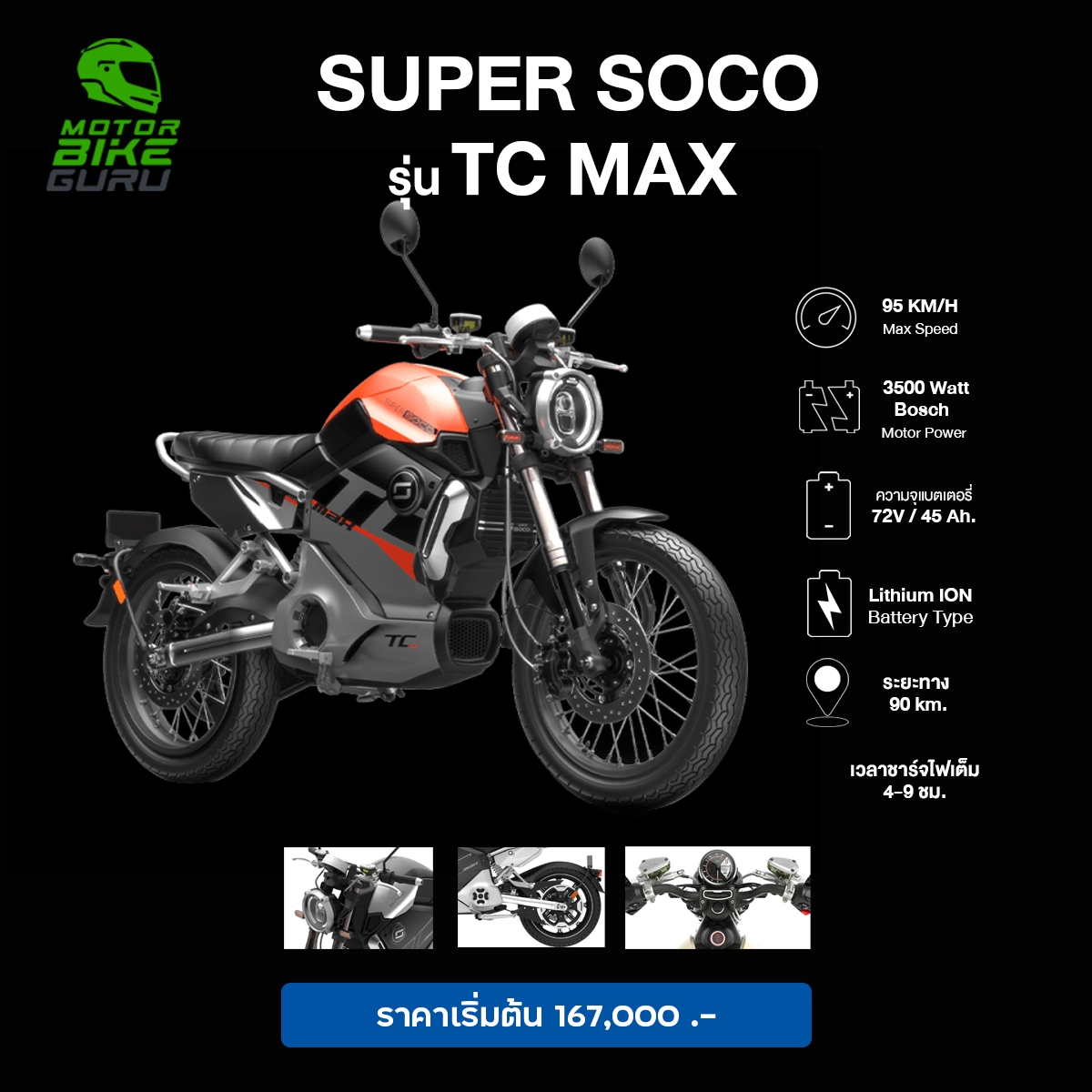 Super Soco รถมอเตอร์ไซค์พลังงานไฟฟ้า ที่นำเข้าและจัดจำหน่ายโดย บริษัท ยานยนต์สะอาด จำกัด จับมือร่วมกับ VMoto ออสเตเลีย พัฒนานวัตกรรมรถมอร์เตอร์ไซค์พลังงานไฟฟ้า หลากหลายรุ่น สำหรับรุ่นที่เรานำมาแนะนำคือ Super Soco TC MAX ให้ขุมพลังความจุ 3,900 W. ความเร็วสูงสุด 95 กิโลเมตรต่อชั่วโมง ระยะทางต่อรอบการชาร์จ 92 กิโลเมตร ให้การประหยัดค่าใช้จ่ายเพียง 8 สตางค์ต่อกิโลเมตร มาพร้อมดีไซน์ในรูปลักษณ์แบบคลาสสิก ทรงมินิไบค์ โดยสามารถเสียบชาร์จหรือจะยกแบตเตอรี่ออกมาชาร์จก็ได้เช่นกัน และติดตั้งกลไกมอร์เตอร์เพื่อสร้างความแตกต่างระหว่างการใช้งาน ให้ผู้ขับขี่สามารถขับขี่ได้อย่างสบาย