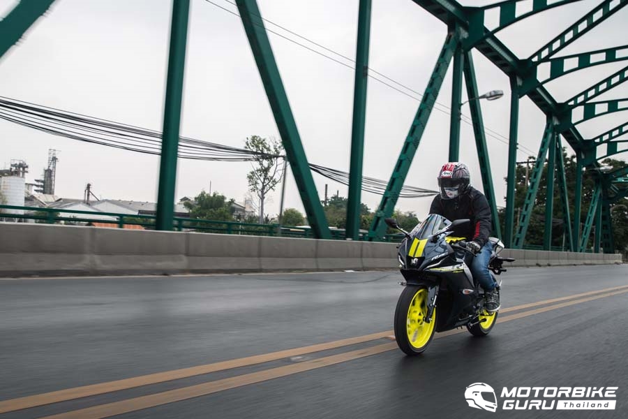 เส้นทางจากถนนในเมือง ตัวรถ R15 ให้ความคล่องตัวในการควบคุมทิศทางได้ดั่งใจ การเปิดคันเร่ง เบาเบรก ก็คุมได้ง่าย ขี่ง่ายกว่าบิ๊กไบค์คันใหญ่ แต่ยังได้ฟิลสปอร์ตไบค์ ซึ่งเหมาะกับคนที่มองหาสปอร์ตไบค์ที่ขี่ง่ายและขี่ได้ทั้งวัน ช่วงข้ามสะพานนวลฉวีมีลมข้างปะทะเข้ามา ตัวรถก็ยังให้สมดุลที่ดี