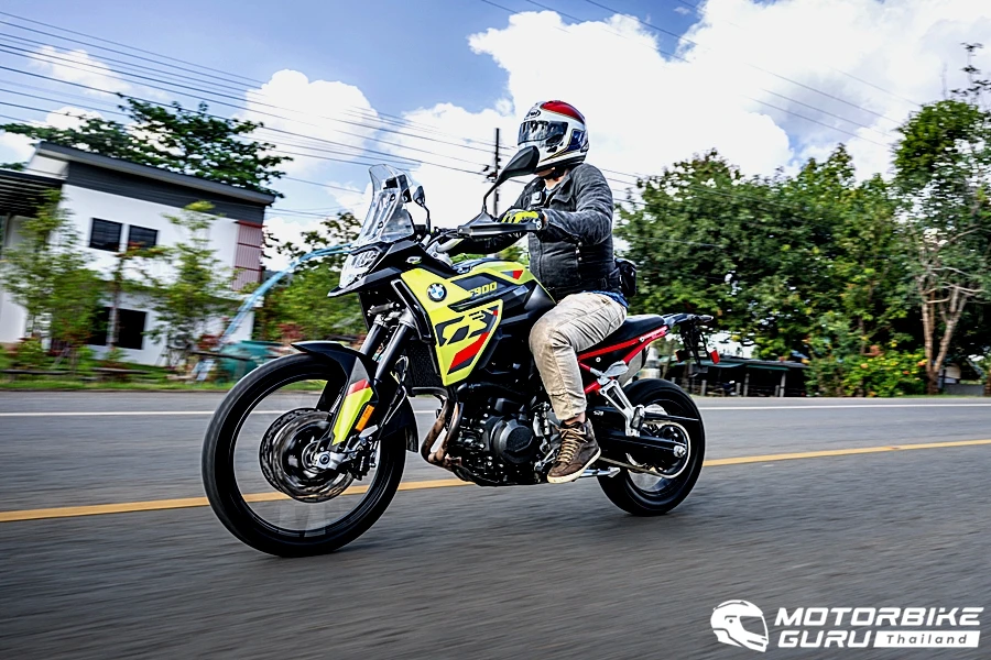 มาถึงช่วงทางฝุ่นหรืออฟโร้ดเบา ๆ สลับเป็นรถเป็น F 900 GS Adventure แต่ก่อนเข้าทางฝุ่นขับผ่านเส้นทางถนนปกตินั้น รุ่นนี้ถือว่าขับขี่สบายกว่าและให้ความนุ่มนวลและอาการสั่นของเครื่องยนต์เบาลงกว่า นับว่าหากขับขี่บนทางดำทั่วไปหรือจะแนวทัวร์ริ่งคันนี้ตอบโจทย์มาก ๆ ครับ ได้ทั้งความเบา นุ่มนวล ขี่สบาย และชิวบังลมที่กั้นลมปะทะลำตัวหรือหมวกได้ดีเกินคาด ให้ความคล่องตัวพริ้วในโค้งได้ดี แม้ถังน้ำมันจะใหญ่ขึ้นก็ตาม