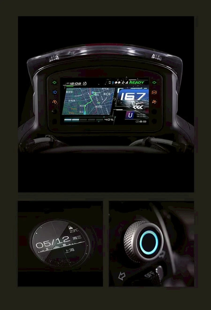 ภายในแผงหน้าปัดเป็นหน้าจอ TFT-LCD ขนาด 7 นิ้ว แสดงข้อมูลต่าง ๆ เช่น ระบบนำทาง เพลง ตรวจวัดแรงดันลมยาง สถานะแบตเตอรี่ และรองรับการเชื่อมต่อกล้อง DJI