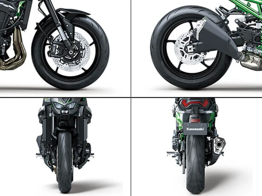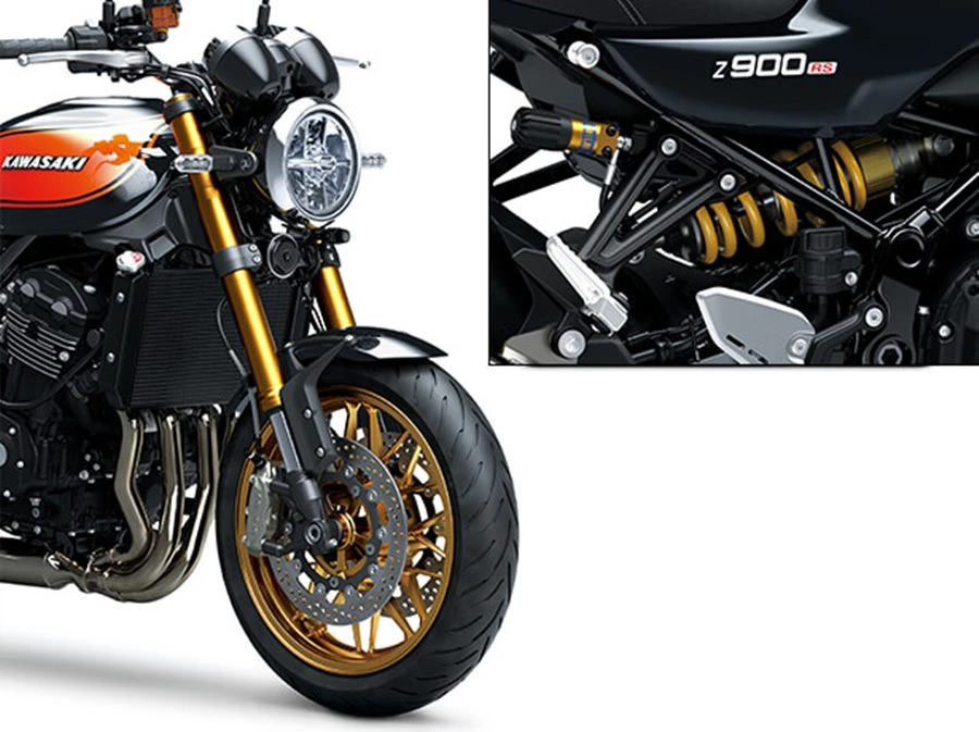 ล้อที่ออกแบบมาอย่างประณีตช่วยเสริมภาพลักษณ์ Z900RS น้ำหนักใต้สปริงที่เบา (ด้วยชิ้นส่วนต่างๆ เช่น สวิงอาร์มและล้อ)ช่วยให้การควบคุมรถเป็นไปอย่างนุ่มนวลและเป็นธรรมชาติ