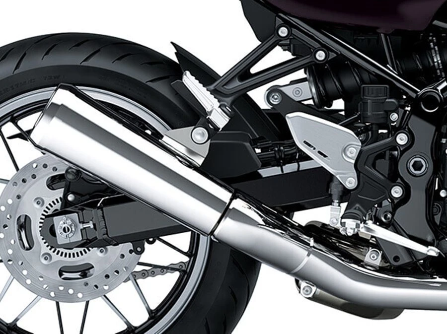 ระบบไอเสียได้รับการออกแบบมาเพื่อเน้นย้ำถึงเครื่องยนต์สี่สูบเรียง (In-Line Four) ท่อเฮดเดอร์แบบผนังคู่ไม่เพียงแต่ทำให้ระบบไอเสียดูแข็งแกร่งยิ่งขึ้น แต่ยังช่วยป้องกันการเปลี่ยนสีเมื่อเวลาผ่านไป การไม่มีท่อเชื่อมต่อหรืออุปกรณ์ไอเสียช่วยให้เส้นสายดูสะอาดตาและต่อเนื่อง เมื่อเทียบกับรุ่นก่อนหน้า ท่อเก็บเสียงแบบเมกะโฟนใหม่นี้ให้ภาพลักษณ์ที่โดดเด่นยิ่งขึ้น ตอกย้ำภาพลักษณ์สปอร์ตย้อนยุคของ Z900RS ท่อเฮดเดอร์, ห้องเครื่อง และท่อเก็บเสียงล้วน