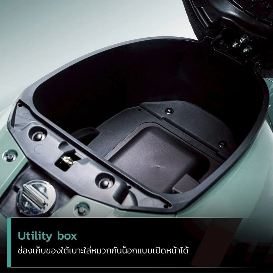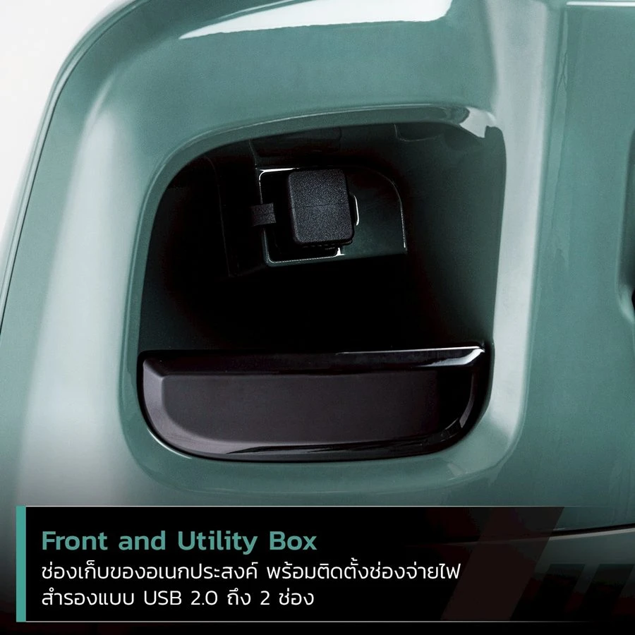 ช่องเก็บของอเนกประสงค์ด้านหน้าคนขับ ที่มีช่องจ่ายไฟสำรองแบบ USB ถึง 2 ช่อง สะดวก ง่าย ต่อการใช้งาน พร้อมกล่องเก็บของใต้เบาะที่สามารถใส่หมวกกันน็อกแบบครึ่งใบ และของใช้อื่น ๆ อย่างเต็มที่
