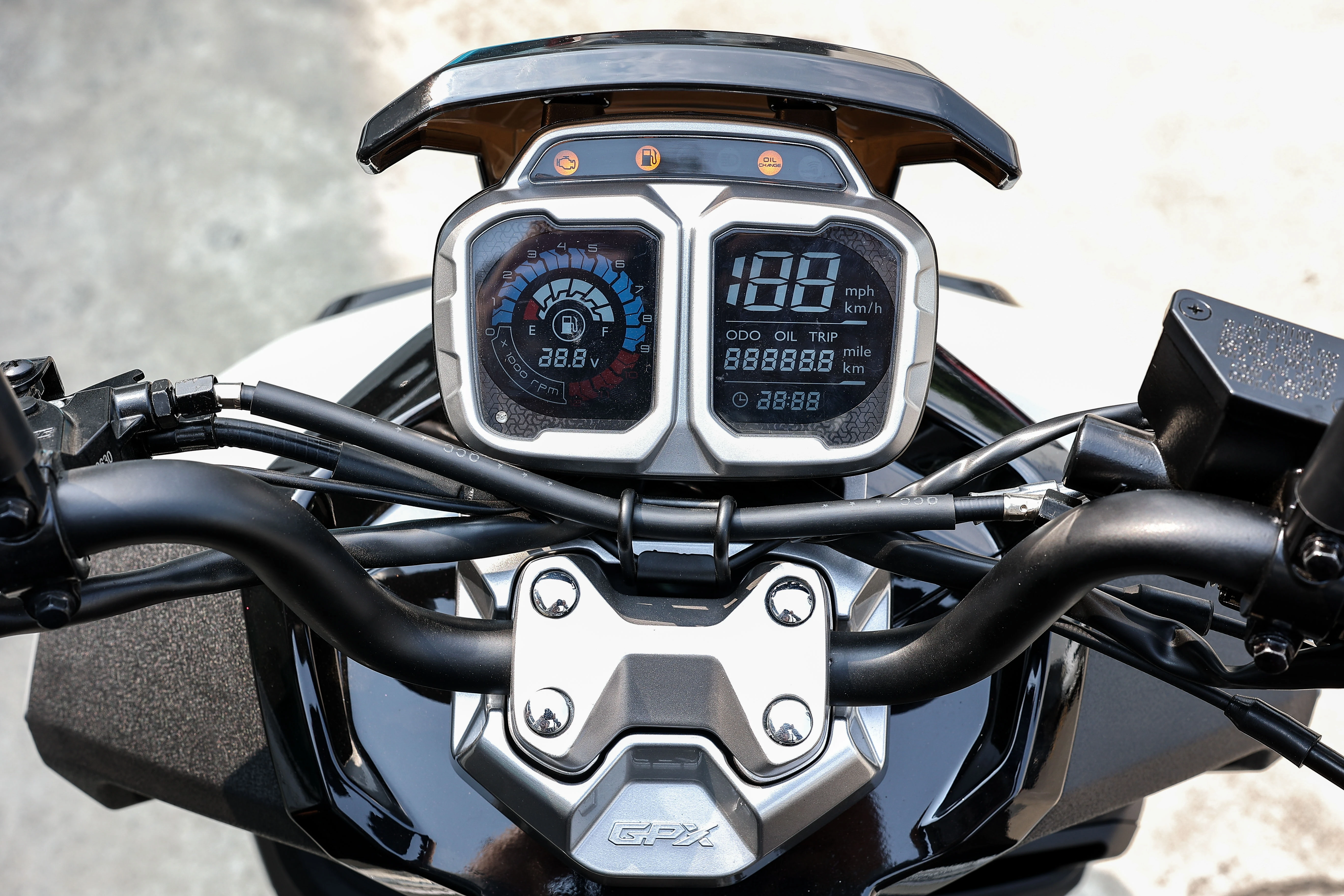 จุดเด่นที่ว้าวใน New GPX DX 1 ไฟหน้าคู่แบบ Full LED สว่างชัดเจนทุกสภาพถนน และระบบไฟรอบคันแบบ Full LED เช่นกัน ทั้งไฟท้าย ไฟเลี้ยวที่สว่างชัดเจน และยังมีมาตรวัดแสดงผลแบบ Full LCD จอแยกฝั่งซ้ายวัดรอบ และระดับแบตฯ 12V ฝั่งขวา บอกความเร็ว ทริป ODO ที่ตั้งค่าได้ 1 ทริป และนาฬิกา นอกจากนี้ยังปรับเปลี่ยนการแสดงหน้าจอได้ด้วยปุ่มโหมดแฮนด์ฝั่งขวา
