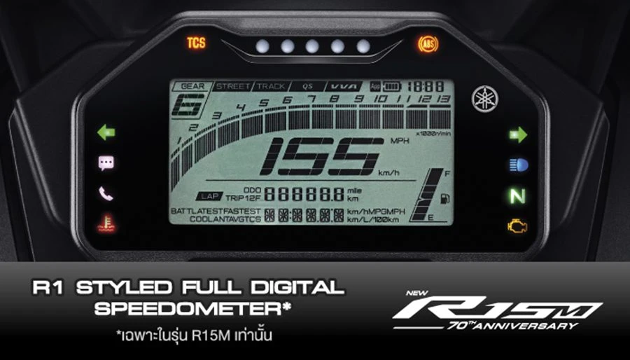 - R1-STYLED FULL DIGITAL SPEEDOMETER หน้าปัดดิจิทัล LCD สไตล์ซูเปอร์สปอร์ต พร้อม TRACK MODE สำหรับสนามแข่ง และ STREET MODE สำหรับการใช้งานทั่วไป