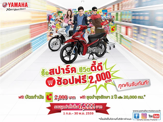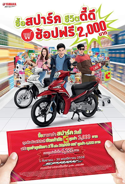 • - ลูกค้าที่ซื้อรถจักรยานยนต์ยามาฮ่าสปาร์ค ทุกรุ่นระหว่างวันที่ 1 กันยายน ถึง 30 พฤจิกายน 2559 รับทันทีบัตรกำนัลบิ๊กซี มูลค่า 2,000 บาท พร้อมรับบัตรยามาฮ่าสมาร์ทแคร์ เปลี่ยนถ่ายน้ำมันเครื่องพร้อมไส้กรองน้ำมันเครื่องฟรี! 2 ปี หรือ 20,000 กิโลเมตร รวม 20 รายการ มูลค่า 4,222 บาท รวมมูลค่าทั้งสิ้น 6,222 บาท