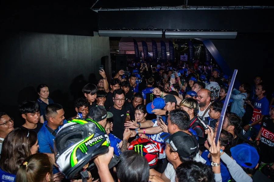 นายพงศธร เอื้อมงคลชัย รองประธานกรรมการบริหาร พร้อมด้วยผู้บริหารระดับสูง บริษัท ไทยยามาฮ่ามอเตอร์ จำกัด ให้การต้อนรับ เอลดิอาโบล ฟาบิโอ กวาร์ตาราโร #20 และนายพลแฟรงค์กี้ ฟรังโก มอร์บิเดลลี #21 นักแข่งชั้นนำของโลกสังกัด มอนสเตอร์ อีเนอร์จี้ ยามาฮ่า โมโตจีพีทีม ในกิจกรรม มีทแอนด์กรี๊ด ที่ยามาฮ่าจัดขึ้นให้กับแฟนๆ กีฬามอเตอร์สปอร์ตชาวไทยอย่างใกล้ชิด ที่บูธ YamahaGP Pavilion