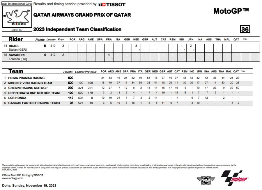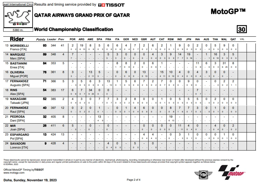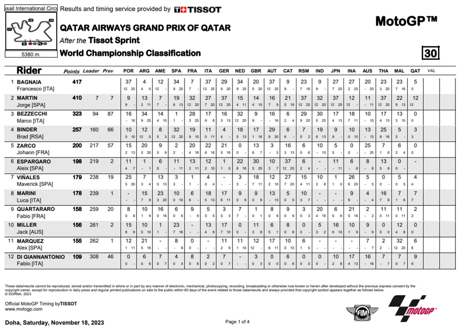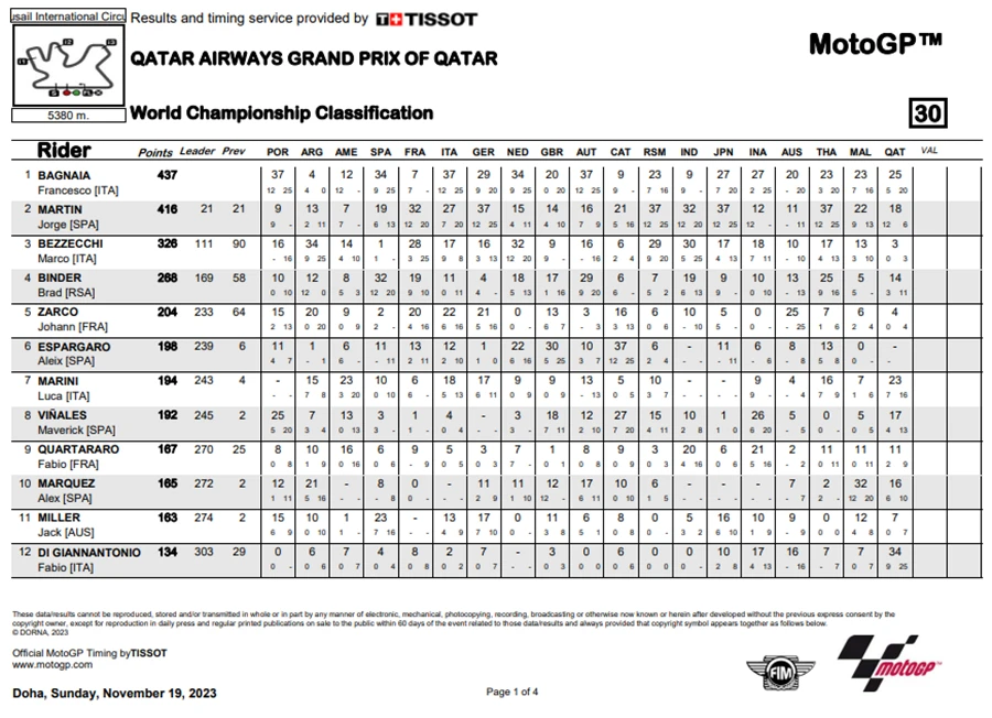 ทำให้การลุ้นแชมป์ในปีนี้ยังต้องไปชิงดำกันในสนามสุดท้ายในรายการ Gran Premio Motul de la Comunitat Valenciana ที่สนาม Circuit Ricardo Tormo หรือ ValenciaGP ที่จะตัดสินแชมป์ประจำปี 2023 ของ MotoGP