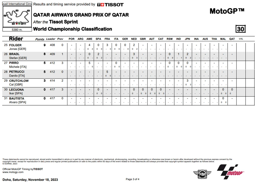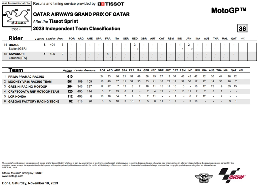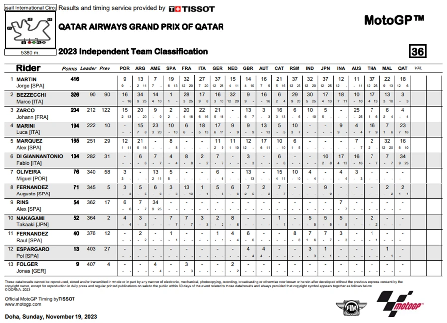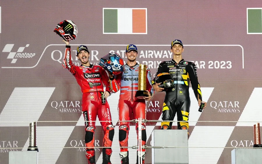 การแข่งขันในสนามที่ 19 ของ MotoGP 2023 ซึ่งเป็นสนามรองสุดท้ายแล้วของปีนี้ โดยการแข่งขัน QatarGP ในรายการ Qatar Airways Grand Prix of Qatar ที่สนาม Lusail International Circuit โดยชัยชนะตกเป็นของ Fabio Di Giannantonio จาก Gresini Racing MotoGP ซึ่งระหว่างการแข่งขัน Francesco Bagnaia จาก Ducati Lenovo Team ขึ้นนำแต่ก็โดน Di Giannantonio แย่งตำแหน่งผู้ชนะ แต่การได้อันดับ 2 ของ Bagnaia ทำให้คะแนนสะสมยังคงนำอยู่า 21 คะแนน ส่วนอันดับที่ 3 เป็นของ Luca Marini จาก Mooney VR46 Racing Team นั่นทำให้โพเดียมของ QatarGp เป็นนักบิดอิตาเลียนทั้งหมด