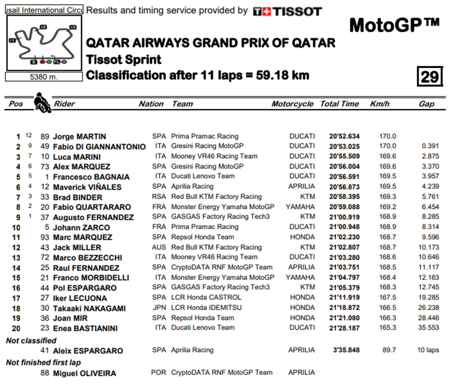 ทันทีที่เริ่มการแข่งขัน เป็นการช่วงชิงโฮลช็อตระหว่าง Marini และ Alex Marquez ที่มาเป็นอันดับสอง แต่ก็มีการปะทะกันระหว่าง Martin และ Bagnaia โดย Martin รั้งอันดับสาม ในรอบต่อมาทั้ง A. Marquez และ Martin ก็ออกห่างกันเล็กน้อย จนเหลืออีกเพียง 7 รอบ A. Marquez ก็พร้อมที่จะสู้อีกครั้ง Marini ยังตอบสนองได้เร็วกว่า นั่นทำให้เจ้าตัวอยู่ห่างออกไปอีกสองสามเมตร และในช่วงชุลมัน Martin ก็อาศัยจังหวะขึ้นมาเป็นอันดับที่ 2 ส่วน A. Marquez หล่นลงมาก็พยายามป้องกันตำแหน่งจาก Di Giannantonio และในที่สุด Martin ก็ขึ้นมานำ และสามารถรั้ง Marini เอาไว้ได้ในโค้งที่ 1 ด้าน A. Marquez ก็ถูก Di Giannantonio แซงขึ้นไปได้ หลังจากนั้นเป้าหมายต่อไปคือ Marini แต่จนในทึ่สุด ก็ไม่สามารถแซงได้ ทำให้ Martin คว้าชัยใน Tissot Sprint Race ตามมาด้วย Di Giannantonio และ Marini ทำให้คะแนนสะสมระหว่าง Martin และ Bagnaia ลดลงมาเหลือ 7 คะแนน