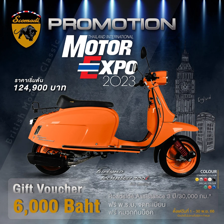 https://booking.lambretta.co.th ตั้งแต่วันนี้ – 11 ธ.ค. 66 รับข้อเสนอเดียวกันกับงาน Motor Expo รวมมูลค่ากว่า 7,000 บาท ดังต่อไปนี้