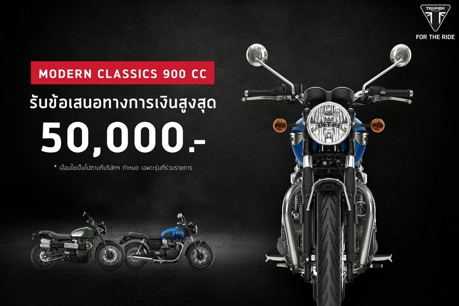 รถจักรยานยนต์ Triumph ในกลุ่มประเภท Modern Classics ในตระกูล Bonneville เครื่องยนต์ 900 ซีซี ที่ประกอบไปด้วย Bonneville T100, Speed Twin 900 และ Scrambler 900 รับข้อเสนอทางการเงินสูงสุด 50,000 บาท
