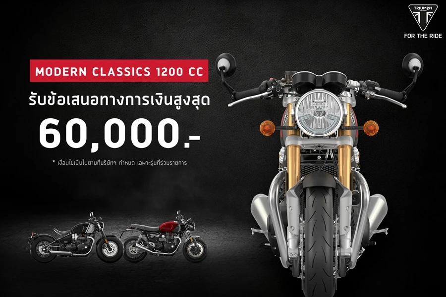 รถจักรยานยนต์ Triumph ในกลุ่มประเภท Modern Classics ในตระกูล Bonneville เครื่องยนต์ 1200 ซีซี ที่ประกอบไปด้วย Bonneville T120, Bonneville T120 Black, Speed Twin 1200, Thruxton RS, Bonneville Bobber, Bonneville Speedmaster และ Scrambler 1200 รับข้อเสนอทางการเงินสูงสุด 60,000 บาท