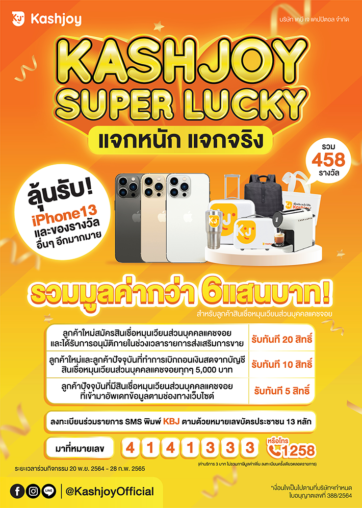 สำหรับใครที่กำลังมองหาสินเชื่อเพื่อเป็นทุนในการสร้างอาชีพ เพื่อจับจ่ายใช้สอย หรือต้องการไว้เป็นทุนสำรองยามฉุกเฉิน สินเชื่อแคชจอยสามารถตอบโจทย์ให้คุณได้ สนใจสมัครสินเชื่อพร้อมร่วมลุ้นรางวัลกับแคมเปญ "Kashjoy Super Lucky แจกหนักแจกจริงมากกว่า 400 รางวัล" ได้ง่ายๆ ด้านล่างนี้เลยนะคะ