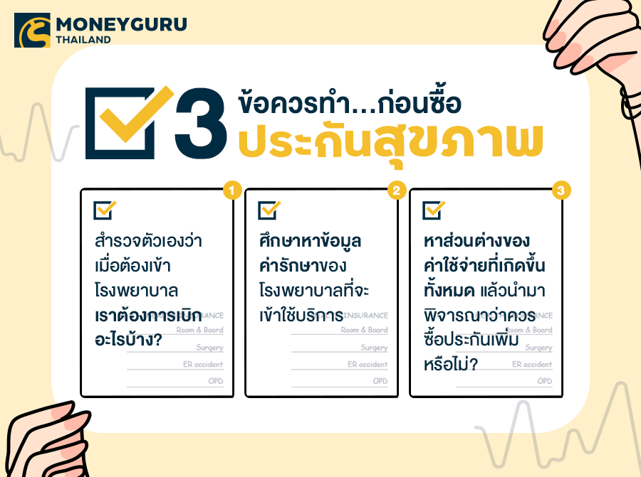 ในข้อนี้ เราจะต้องเริ่มจากการสำรวจสิทธิ์ที่เรามีอยู่ เช่น สวัสดิการการรักษาพยาบาลที่ได้จากบริษัท ให้หาข้อมูลสิทธิ์จากตรงนี้ทั้งหมด และนำมาคิดไตร่ตรองดูว่า มีส่วนไหนขาดเหลืออะไรที่เราอยากได้เพิ่ม เช่น เรื่องของค่ายารักษา ค่าห้องพักเมื่อต้องนอนในโรงพยาบาล หรือแม้แต่ค่ารักษาเฉพาะโรคร้ายแรง ที่เป็นความเสี่ยง และอาจเกิดขึ้นได้กับตัวเรา เช่น โรคมะเร็ง เป็นต้น