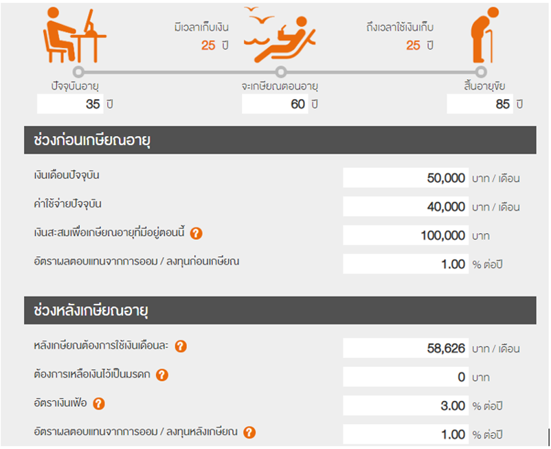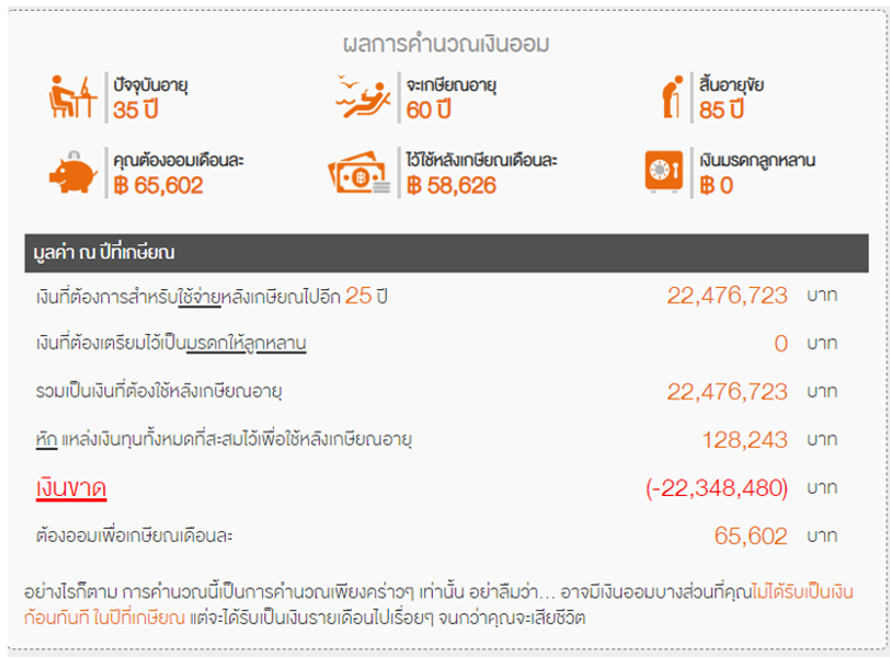 ยกตัวอย่าง อายุ 35 ปี ต้องการเกษียณตอนอายุ 60 ปี และคาดการณ์ว่าอายุยืนถึง 85 ปี แสดงว่า เราจะมีเวลาเก็บเงินอีก 25 ปี และใช้เงินต่อไปอีก 25 ปีที่เหลือ จากโปรแกรม เมื่อลองคำนวณแล้วพบว่า เราจะต้องใช้เงินเกษียณสูงถึง 22 ล้านบาท เมื่อเรารู้แล้วว่า เราจะต้องสะสมเงินเพิ่มอีกเท่าไหร่ เราก็มาดูตัวช่วยเช่น ประกันชีวิต แล้วคำนวณผลตอบแทนจากประกันดูอีกทีว่าช่วยได้มากน้อยแค่ไหนค่ะ