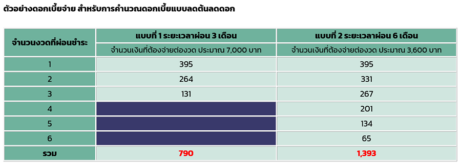 • ดอกเบี้ยจ่ายที่คิดแบบอัตราดอกเบี้ยลดต้นลดดอก (Effective Rate) เท่ากับ 1,393 บาท