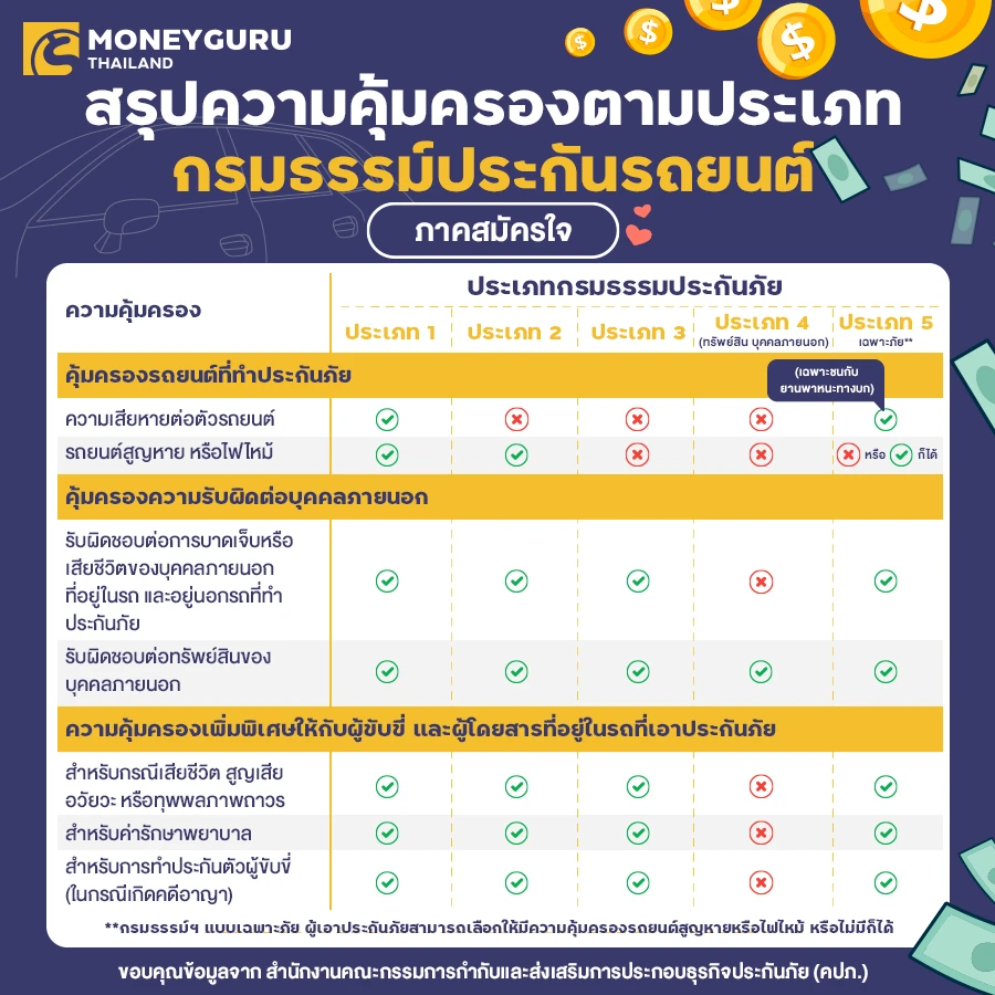ประกันรถยนต์ภาคสมัครใจจะรับผิดชอบต่อความเสียหายส่วนที่เกินจากความรับผิดชอบของประกันรถยนต์ภาคบังคับ (พ.ร.บ.) แบ่งออกเป็นทั้งหมด 5 ประเภท และแต่ละเภทให้คุ้มครองในเรื่องต่างๆ ดังนี้ค่ะ