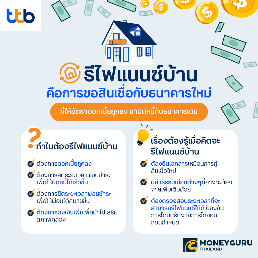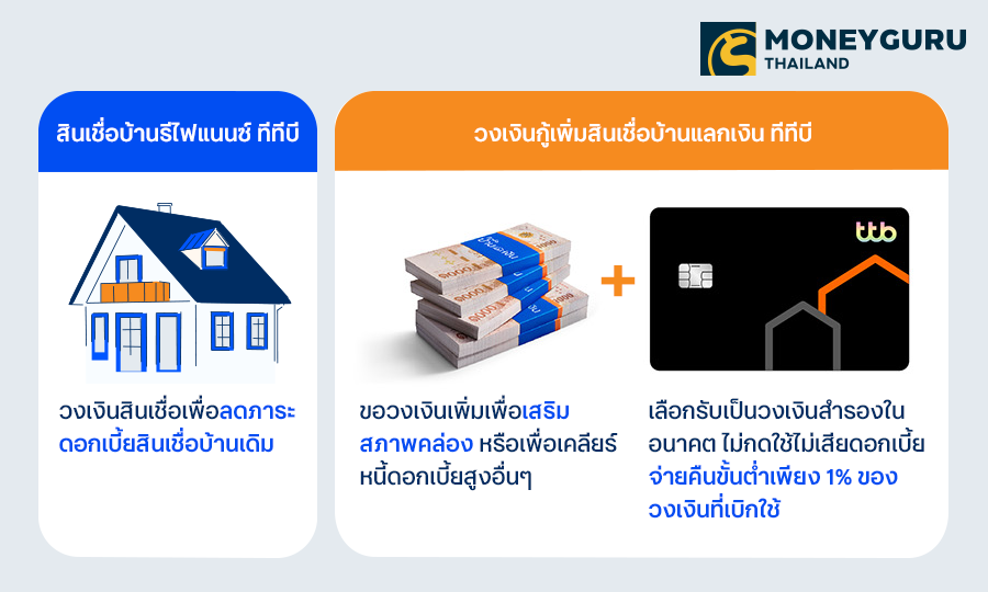 หากเป้าหมายของการรีไฟแนนซ์ คือ ประหยัดดอกเบี้ยได้มากขึ้น ผ่อนต่อเดือนน้อยลง เป็นเจ้าของบ้านได้เร็วขึ้น และขอวงเงินกู้เพิ่มเสริมสภาพคล่องได้ วันนี้เราขอแนะนำ "สินเชื่อบ้านรีไฟแนนซ์" จากธนาคารทีเอ็มบีธนชาต (ทีทีบี) เป็นสินเชื่อที่ตอบโจทย์ ได้จบ ครบทุกความต้องการ